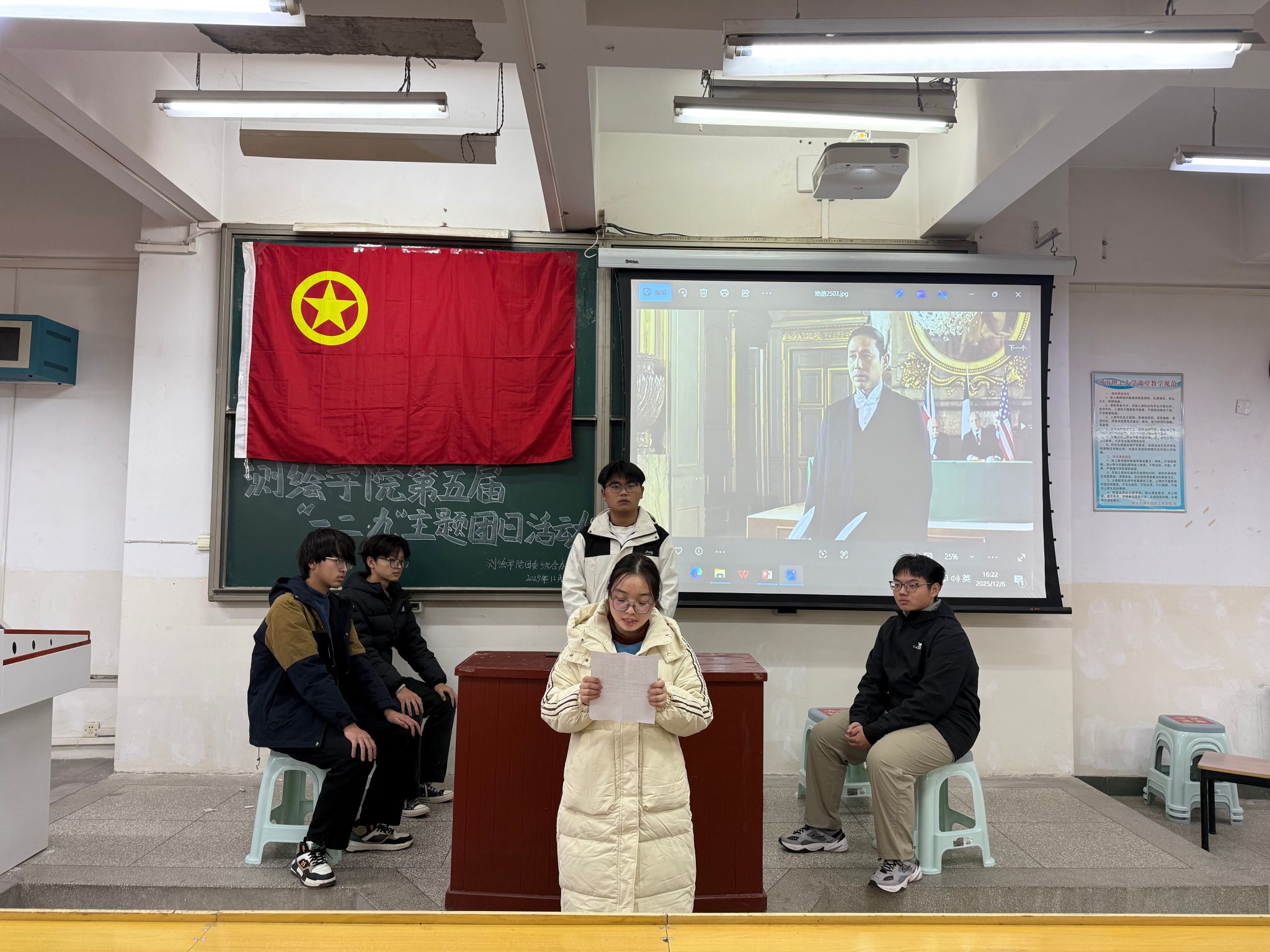 团委在院楼301教室组织开展第五届“一二·九”主题团日活动。学生会主席杨昊、青协会长张为淘、青年宣传中心主任孔子毅、团委学生副书记侯亦菲、团委学生副书记乔斯琪以及团委综合办公室各部门部长作为此次比赛评委,比赛由团委秘书处何世杰主持。