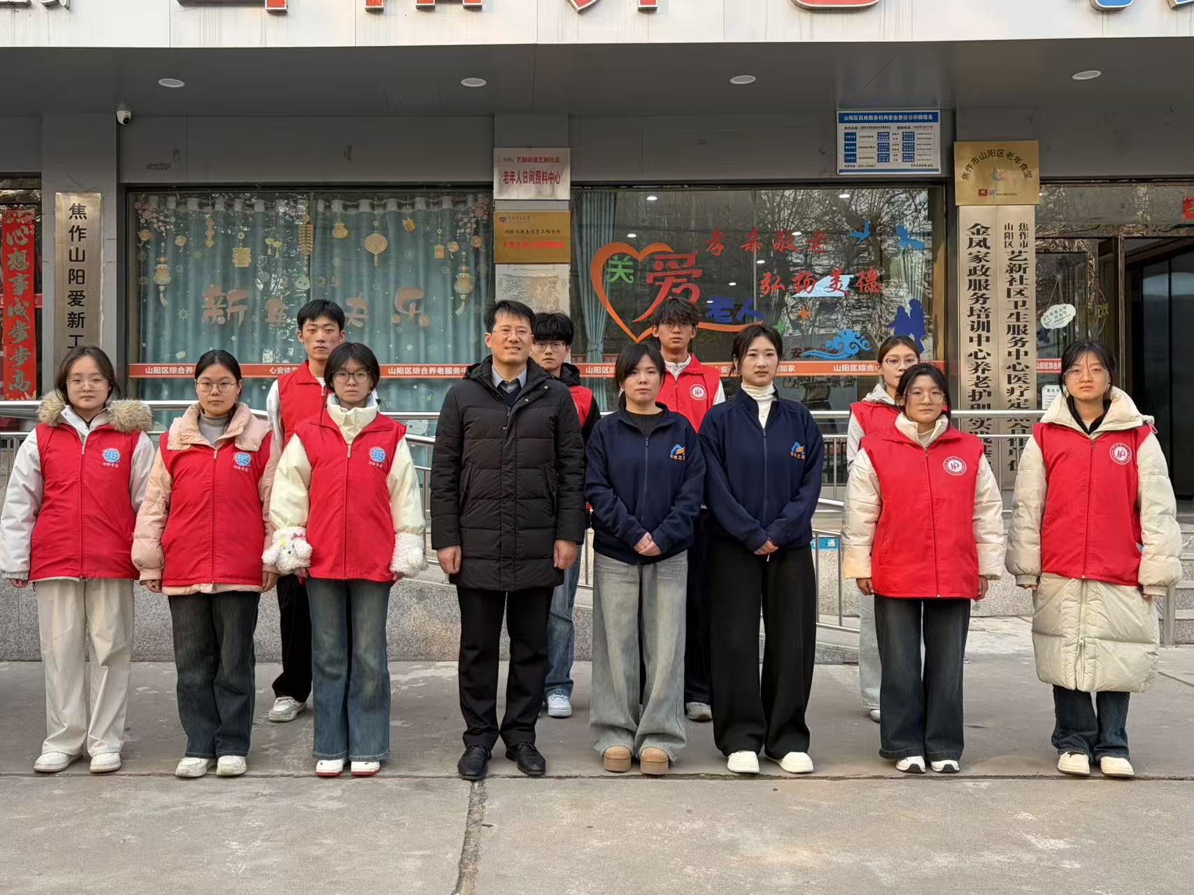团委书记丰习才带领青协志愿者们,于山阳区养老服务中心开展了测绘与国土信息工程学院大学生社会实践基地挂牌仪式。